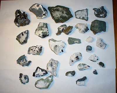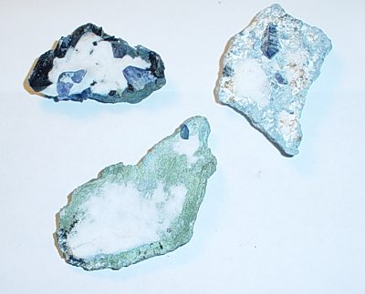 All of the pieces had some natrolite coatings. Most of the natrolite was less then 1 cm thick indicating that any xls underneath would be usually less than 1 cm. Upon inspection with a hand lens only one had any benitoite present but, seven of the pieces had visible neptunite along the edges. Pictures were taken before and after treatment so a comparison could be made.