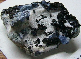 Glenn Morita - Washington  Well I just finished cleaning the last of my batch of mine run.  Most of the pieces had small (<3mm) benitoite crystals with two that had 5mm highly included and fractured benitoites.  One piece had some very nice neptunites to 16mm x 5mm.  This is the one specimen that meets or exceeds the cost of the batch.  Overall I am pleased although I wish I had found a good benitoite to go along with the neptunite.