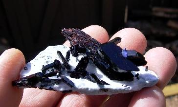 Dan Evanich - California - I've gone through three batches of the mine-run material and, in processing it, have learned a lot about the characteristics of neptunite and the associated matrix material.  I am very pleased overall with my purchases from both you and Steve Perry and plan to pick up some more soon.  My favorite finds include primarily neptunite specimens.  One was a double terminated 4cm crystal with another 2.5cm double terminated tabby laying across the middle.  The neat thing was that there was a small terminated benitoite right in the apex of the two crystals!  Here's a photo or two of some of the finished material got one great piece in the small lot I ordered. There are at least 20+ fully terminated neptunites emerging from natrolite. The longest ones are 1.5 cm. With a single 1.5 cm doubly terminated crystal. Also a small partial benitoite on the side. Very exciting stuff