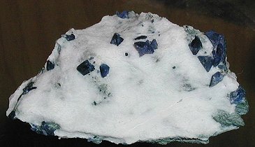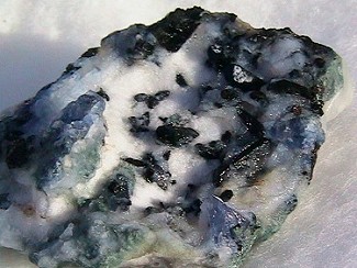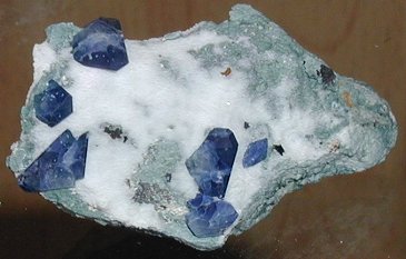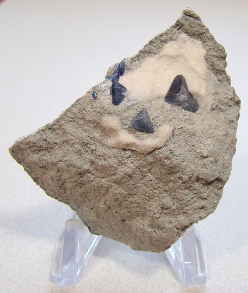 I now have a great appreciation for what it takes to prepare one of these specimens.  For this rock, I had to remove most of the natrolite to expose the fairly small crystals.  I think I did that part okay.  But I was lucky that the crystals were anchored in the crossite so did not come loose as the natrolite gelled in the acid.  After washing in water and soaking in sodium hydroxide solution I was surprised to learn that a lot of the surface is a bluish clay that, I think, should be removed.  I learned to do that with a dental pick, and with great care.  I lost two 2mm benitoites before I really got the hang of it and learned what not to do.  As it is, the specimen could use some additonal cleaning, but I think I've about reached the point where I'd better stop messing with it.