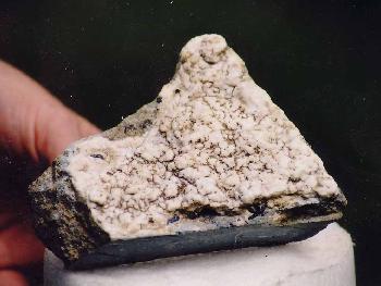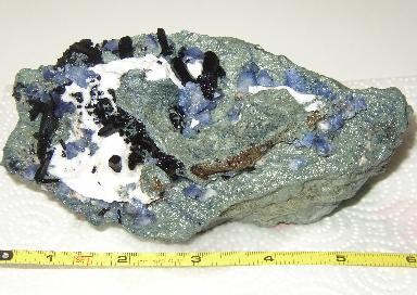 9. This was a very irregular piece with natrolite in a wide, deep fold in the schist. Treatment revealed a small benitoite (0.5 cm) on one end and 3 joaquinite (1-2 mm) on the opposite side, at the bottom of the fold.