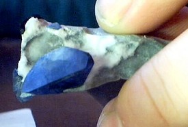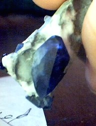 I have been making good time etching material from the last 20kg order. I have pretty much finished the smaller pieces and was working on one of the somewhat larger ones when Lady Luck dealt me a winning hand.  This rock was about 15 X 10 X 7cm unetched and had Benitoite showing at two places, disapearing under an area of crossite.  The first surprise was that the crossite did not contact the Benitoite as badly as first thought, the second surprise was that all of the Benitoite I saw turned out to be one huge 1.5 INCH crystal!  As I continued to etch I was at first disapointed to find that the termination was in pretty bad shape, as the piece already had damage at the edges, but they say every cloud has a silver lining, this one was bright blue!  From this damaged crystal I plucked the two largest pieces of clean facet rough I have ever had, 7.37ct  and 9.03ct.  And just for icing on the cake, there were several smaller undamaged tabular crystals on the remaining matrix that make for a very nice specimen.